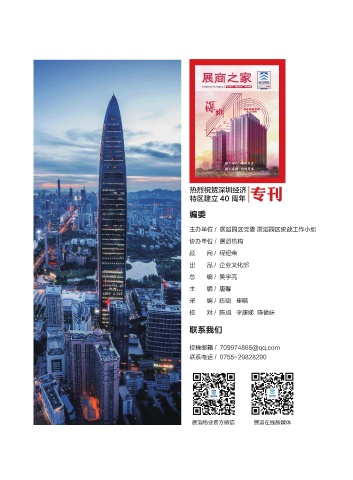 热烈祝贺深圳经济 特区建立 40 周年 专刊 编委 主办单位 / 展滔园区党委 展滔园区统战工作小组 协办单位 / 展滔机构 顾 问 / 程绍荣 出 品 / 企业文化部 总 编 / 吴宇亮 主 编 / 唐馨 采 编 / 陈聪 崔唱 校 对 / 陈旭 李康娣 陈俊妹 联系我们 投稿邮箱 / 709974865@qq.com 联系电话 / 0755-29828290 展滔物业官方微信 展滔在线新媒体