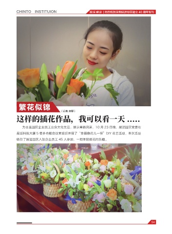 CHINTO INSTITUION 园区精彩 | 热烈祝贺深圳经济特区建立 40 周年专刊 繁花似锦 (记者 唐馨) 这样的插花作品,我可以看一天 ..... 为丰富园区企业员工业余文化生活,展示青春风采,10 月 23 日晚,展滔园区党委在 展滔科技大厦 5 楼多功能会议室组织开展了“幸福像花儿一样”DIY 花艺活动,本次活动 吸引了展滔园区入驻企业员工 45 人参加,一同体验插花的乐趣。 54