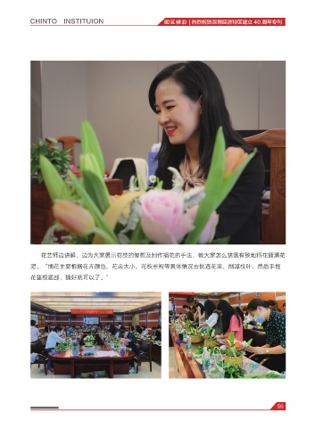 CHINTO INSTITUION 园区精彩 | 热烈祝贺深圳经济特区建立 40 周年专刊 花艺师边讲解,边为大家展示花枝的修剪及制作插花的手法,教大家怎么错落有致地将花插满花 泥。“插花主要根据花卉颜色、花朵大小、花枝长短等具体情况去挑选花束、削减枝叶,然后手捏 花茎根底部,插好就可以了。” 56