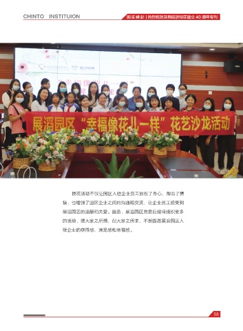 CHINTO INSTITUION 园区精彩 | 热烈祝贺深圳经济特区建立 40 周年专刊 插花活动不仅让园区入驻企业员工放松了身心、陶冶了情 操,也增强了园区企业之间的沟通和交流,让企业员工感受到 展滔园区的温暖和关爱。据悉,展滔园区党委后续将组织更多 的活动,想大家之所想、创大家之所求,不断提高展滔园区入 驻企业的获得感、满足感和幸福感。 58