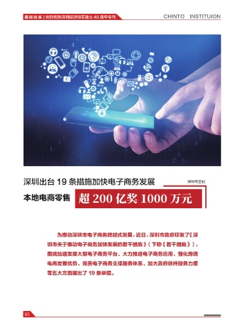 最新政策 | 热烈祝贺深圳经济特区建立 40 周年专刊 CHINTO INSTITUION 深圳出台 19 条措施加快电子商务发展 深圳特区报 本地电商零售 超 200 亿奖 1000 万元 为推动深圳市电子商务跨越式发展,近日,深圳市政府印发了《深 圳市关于推动电子商务加快发展的若干措施》(下称《若干措施》), 围绕加速发展大型电子商务平台、大力推进电子商务应用、强化跨境 电商发展优势、完善电子商务支撑服务体系、加大政府扶持服务力度 等五大方面提出了 19 条举措。 83